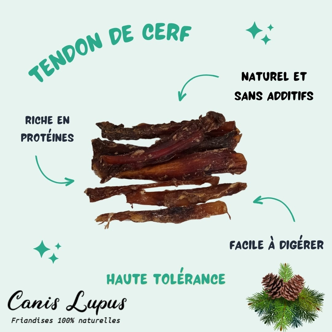 Offrez à votre chien une friandise longue durée et délicieuse avec le Tendon de Cerf, une collation naturelle idéale pour satisfaire ses instincts de mastication tout en prenant soin de sa santé. Ce tendon de cerf séché, 100% naturel, est riche en protéines de haute qualité et faible en matières grasses, ce qui en fait une option saine et nutritive pour tous les chiens, même ceux suivant un régime spécifique.